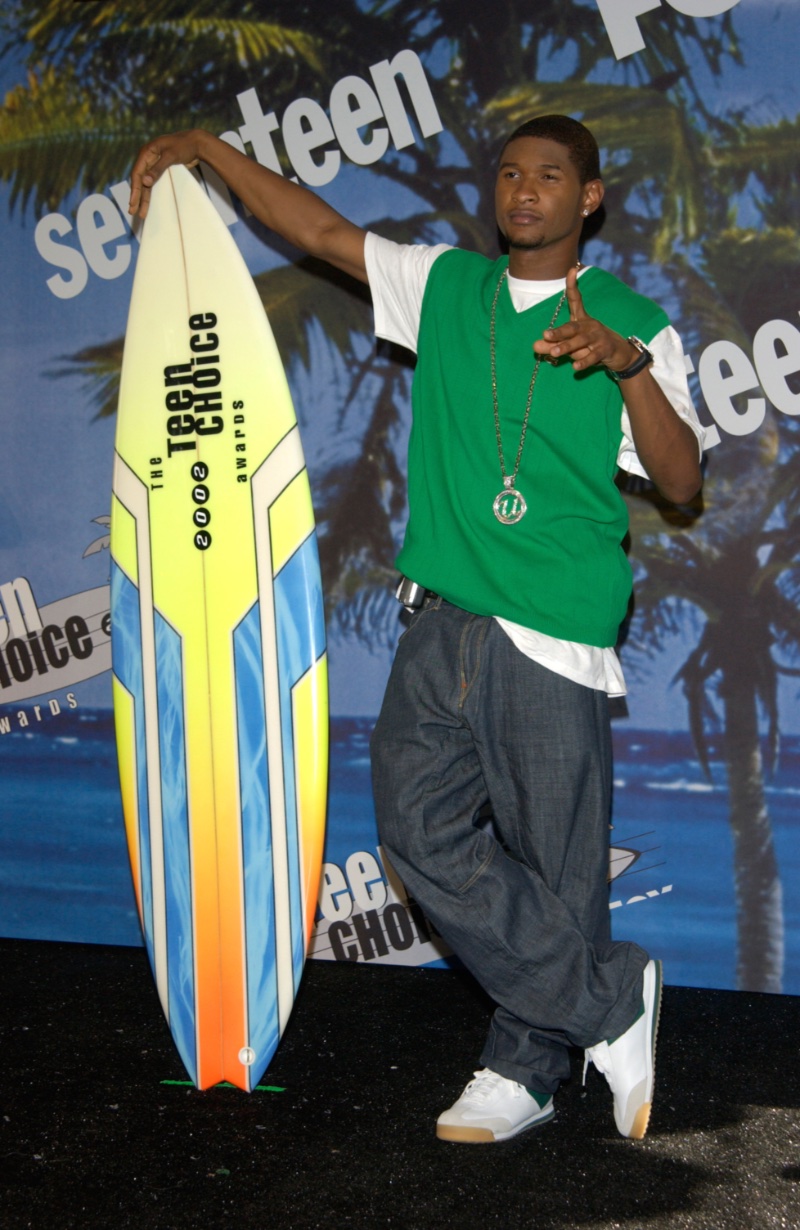 A throwback to classic early 2000s hip-hop-inspired fashion. The outfit features a vibrant green sleeveless sweater layered over a crisp white oversized T-shirt, creating a strong contrast and relaxed silhouette. The denim jeans are baggy, sitting low on the waist with a visible belt and exaggerated pant legs that add to the signature Y2K urban aesthetic.The look is completed with a pair of white sneakers that incorporate green and gum sole accents, subtly tying back to the green of the sweater. Accessories play a defining role: a long silver chain necklace with a circular pendant adds a touch of hip-hop bling, while a sleek wristwatch enhances the outfit’s polished yet effortless appeal.For grooming, the clean-cut hairstyle features a sharp, structured hairline, emphasizing a fresh, youthful presence. The entire ensemble reflects a confident and laid-back persona, perfectly aligned with the Teen Choice Awards’ fun and casual atmosphere.
